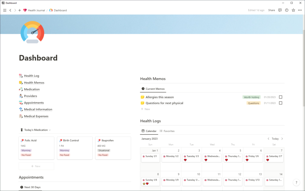 The dashboard is where you see a quick overview of everything related to your health. Read or access your current memos and to-dos, receive reminders for your daily medication, track your health logs and appointments, or get a quick view of your yearly expenses. The navigation menu at the top makes this page a hub for all of your health journaling and documentation.