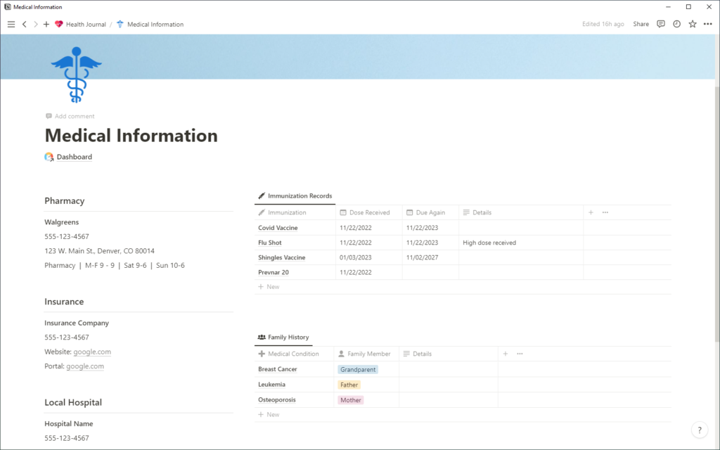 The medical information page is a good place to store additional contacts you access on a regular basis. Keep your immunization record and family history in one place so you don’t have to scramble when you see a new provider.