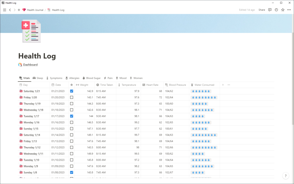 Your health log is just that – a day-by-day record of your health. Create a new entry each day to track your vitals, sleep, symptoms, allergies, blood sugar, pain, mood, or cycle. You can pick and choose what is most relevant to you.
