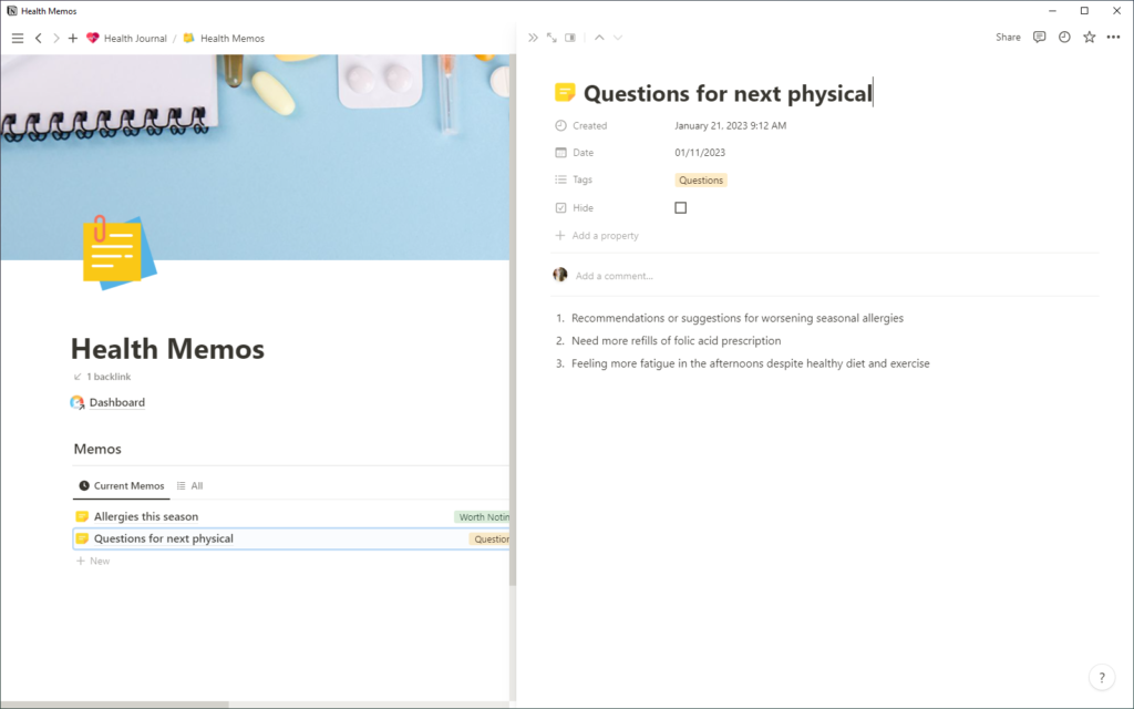 Health memos are meant to be an outlet for notes, questions and concerns, journaling, reminders, or anything you wish to document about your health. Use them as a space to document questions for upcoming appointments or document more about what is happening in your life when symptoms or allergies kick into gear.